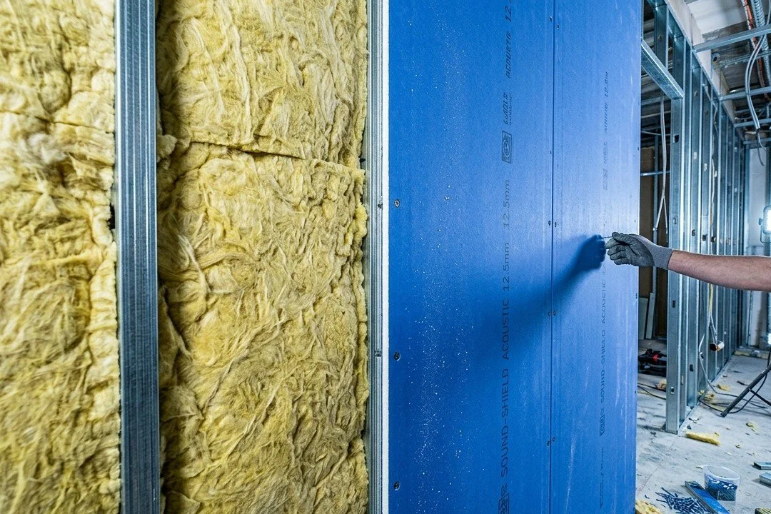 Mineral wool or fibreglass insulation is commonly used within walls and ceilings. These materials absorb sound and prevent it from travelling between spaces.